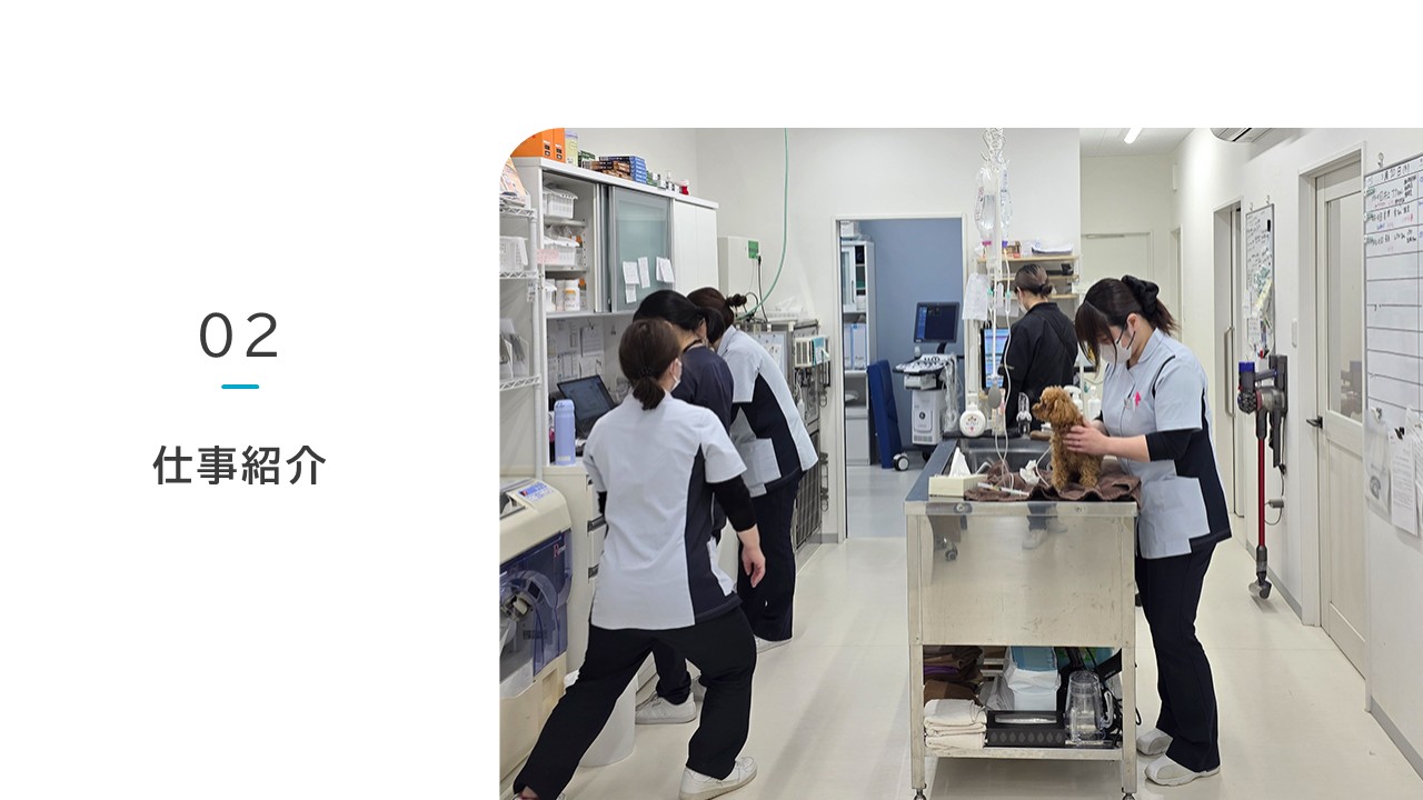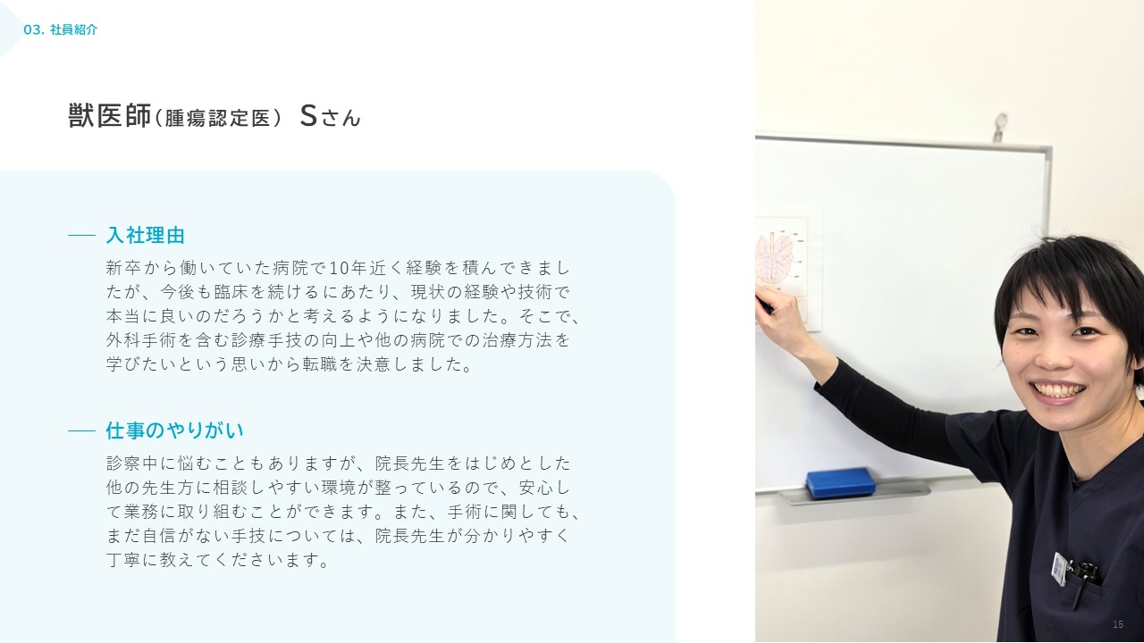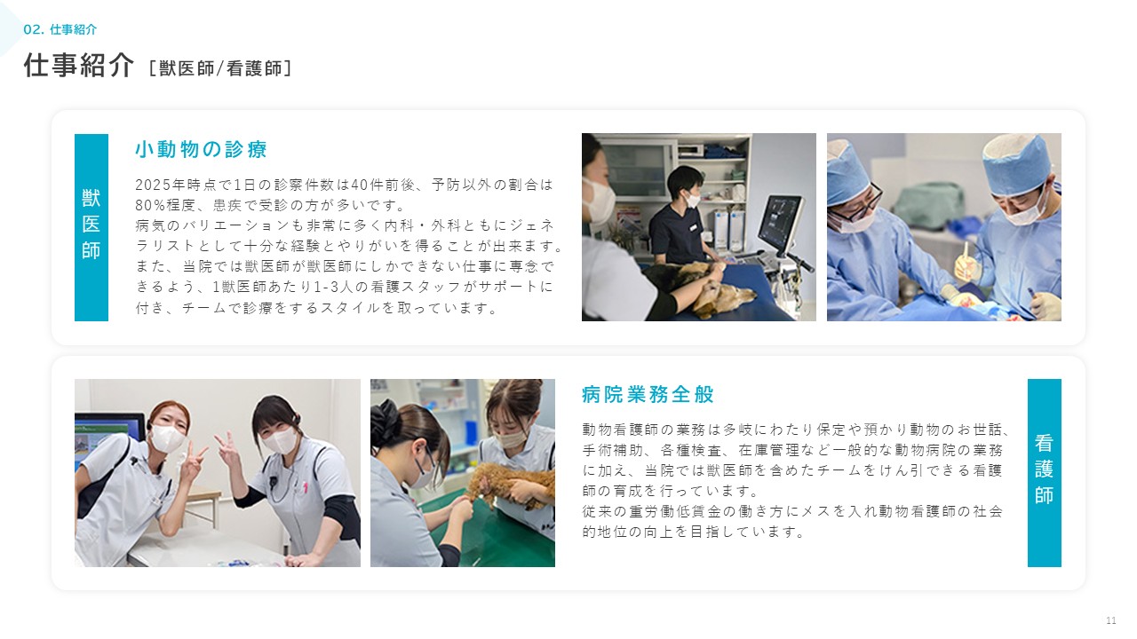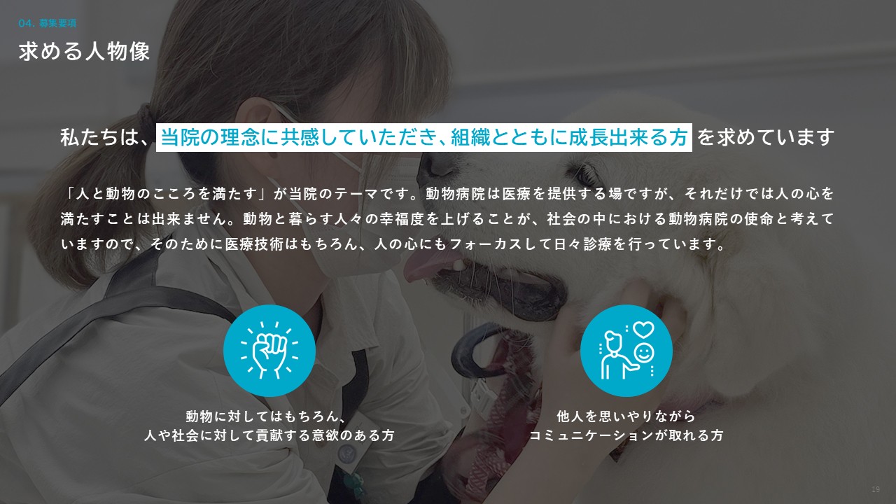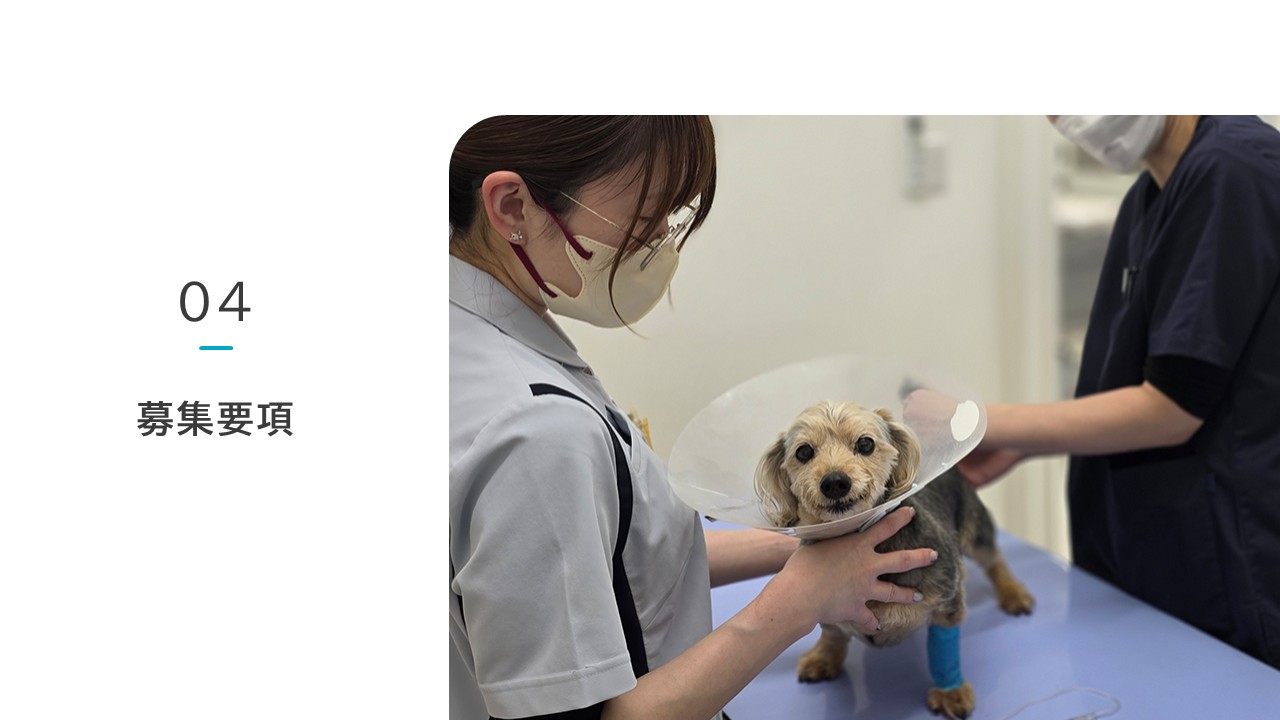 “人と動物のこころに寄り添う”ことを大切にしつつ、地域の中核となる動物病院を目指しています。現在15名のスタッフが在籍していますが、来院患者数の増加に伴い積極的にスタッフの増員を行っています。