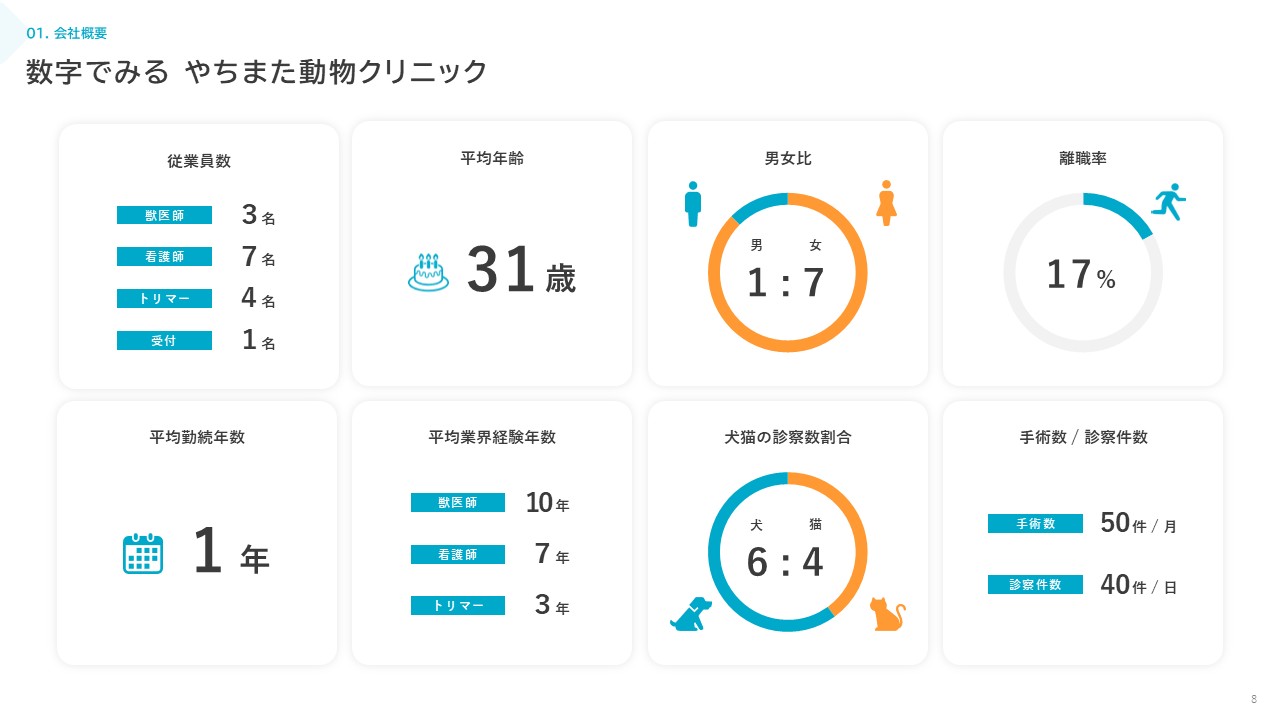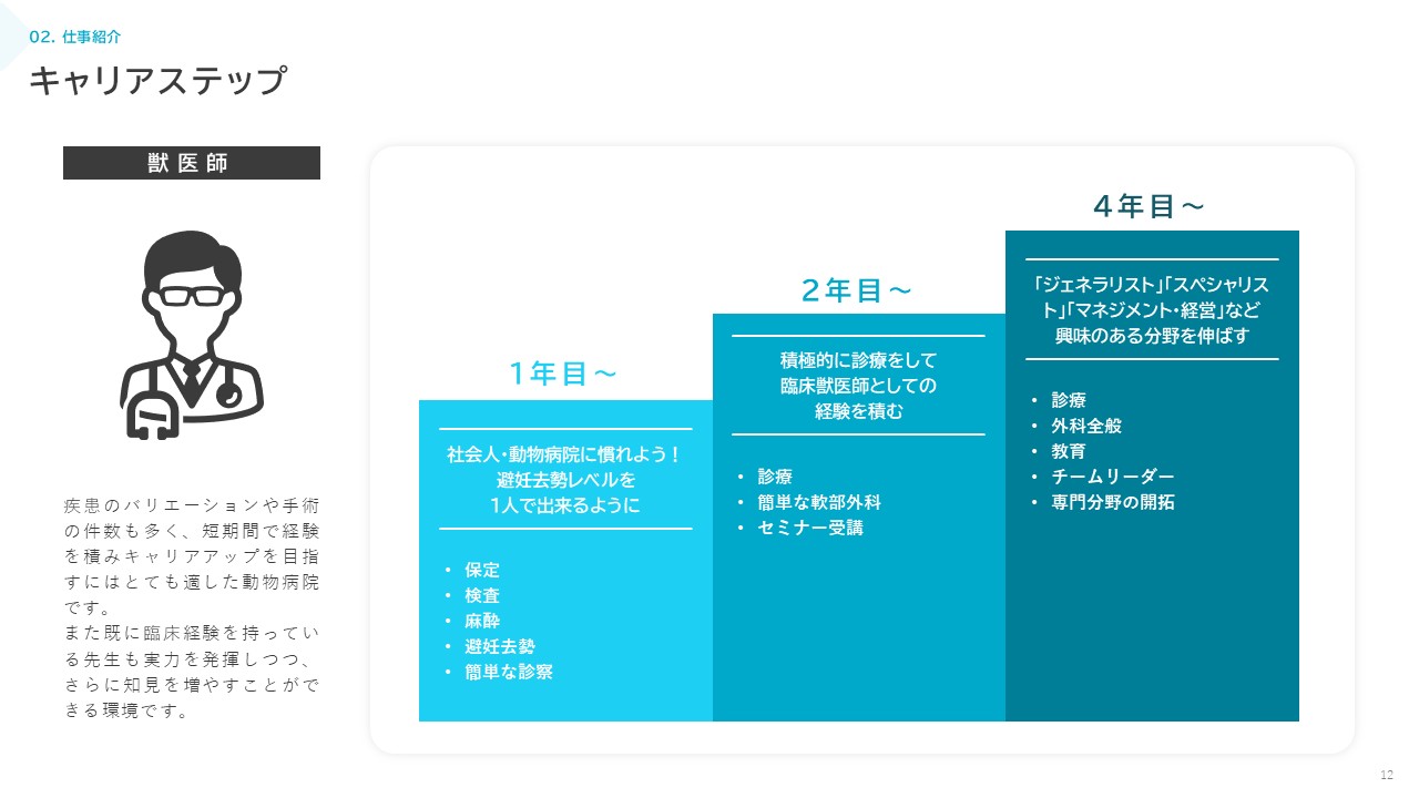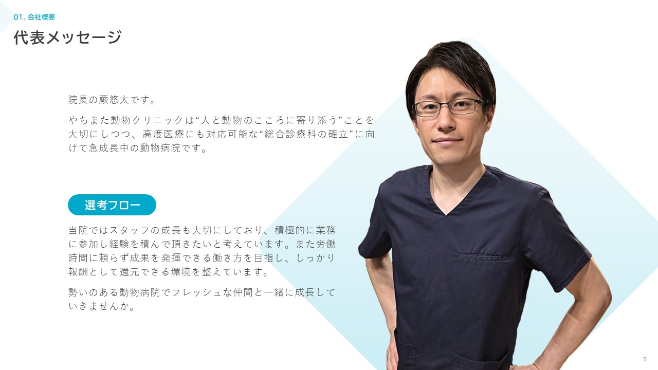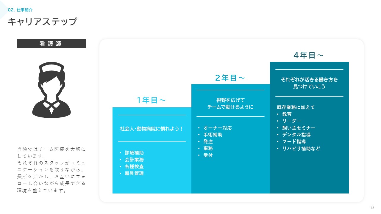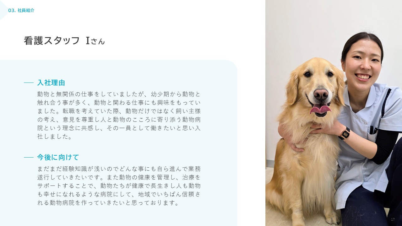“人と動物のこころに寄り添う”ことを大切にしつつ、地域の中核となる動物病院を目指しています。現在15名のスタッフが在籍していますが、来院患者数の増加に伴い積極的にスタッフの増員を行っています。